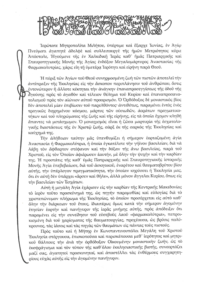 Ετελέσθη με ιδιάιτερη κατάνυξη , χοροστατούντος  του Μητροπολίτου Μιλήτου κ. Αποστόλου, ο Μέγας Αρχιερατικός Εσπερινός επί  τη ιερά  μνήμη της Προστάτιδος και Τροφού της Μονής, αγίας Αναστασίας της Φαρμακολυτρίας.
