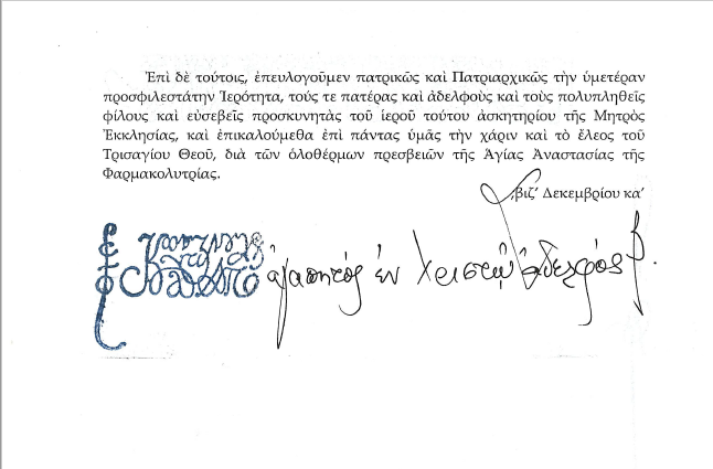 Ο Οικουμενικός Πατριάρχης κ. Βαρθολομαίος απέστειλε προς τον Ηγούμενο και τους προσκυνητές  της Ιεράς Μονής, εορταστικό χαιρετισμό και τις πατρικές του ευχές.
